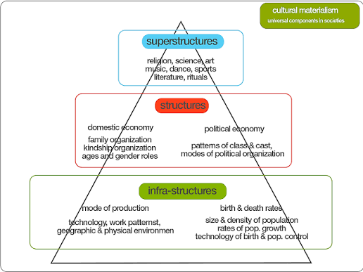 NoösphereAP is heavily influenced by the anthropological theory of cultural materialism which says that in the pyramid below, the influence is primarily bottom-up. I reference it in Post #5.1. The Noösphere that I’m writing about encompasses the Superstructure and Structure tiers.