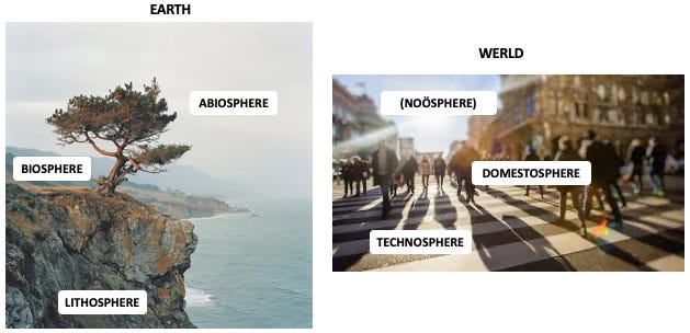 Domestosphere (I made this up.) - Creatures that inhabit the Technosphere and depend on it as an intermediary for meeting their basic survival needs: thermoregulation, water, food. Their requirements are the same as the Biosphere members’, but Domestosphere beings don’t know how to meet those needs directly on Earth. These include humans (but not all of them), and species whom those humans keep as crops, livestock and pets.