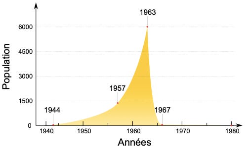 1944 - During World War II, the US Coast Guard sets up a station on a remote island off the coast of Alaska. It’s 138 square miles. They release 29 reindeer onto it as a backup food source for the men working there… The men wrap up their work there and abandon the island, without hunting any reindeer. There are no predators on the island. Lichen (symbiotic fungi + algae) grew in “mats 4 inches thick”.