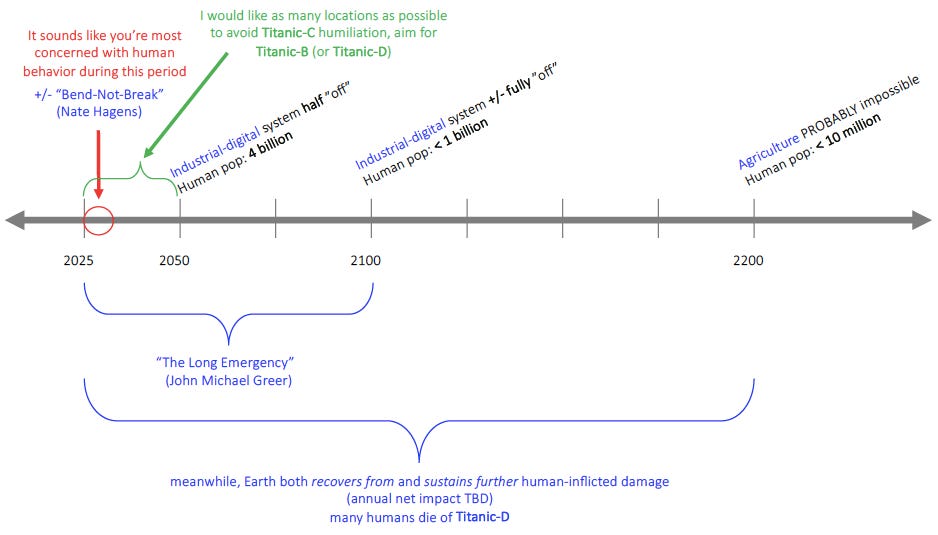 You noted that we have distinct views of the timeline and asked if my cluster has a term for the transition period between now and some end state. I’m realizing now that we refer to a “Long Emergency” (taken from John Michael Greer’s book), but it lasts the whole century.