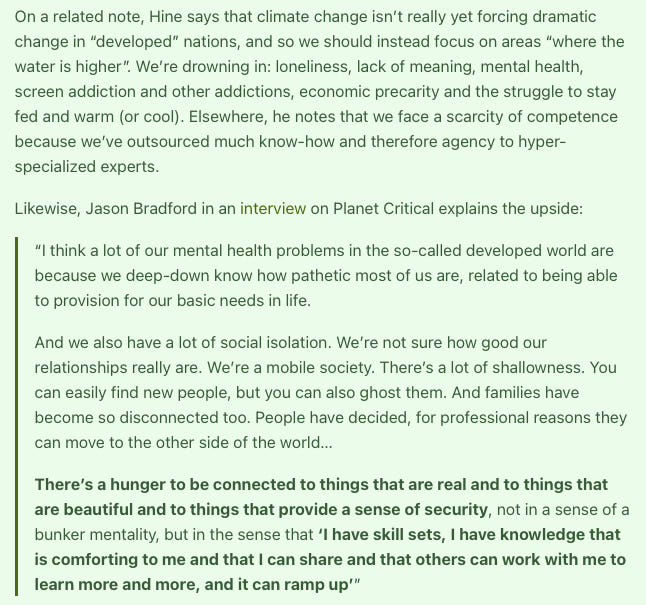 appreciated the UN piece by Bendell. Also a shoutout regarding ‘certainty’ and it’s possible/likely wrongness - I think of old oil drum heads disillusioned and suffering a long letdown about things peaking. Maintaining momentum and purpose in the face of unknowing isn’t easy at all.